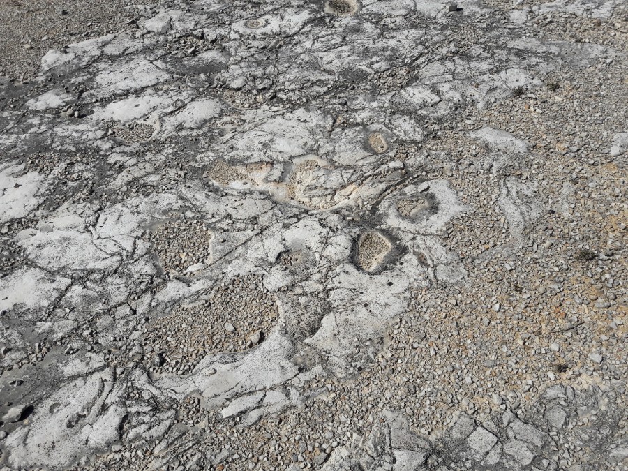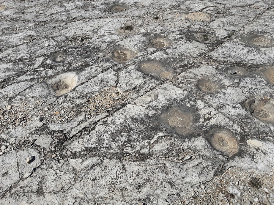 spuren Europas wurden. Die Spuren von Cava Pontrelli wurden in einer Anzahl von etwa 30.000 von mindestens 5 verschiedenen Arten von Dinosauriern im Schlamm erhalten geschätzt. Aus geostratigraphischer Sicht ist die Kreidezeit Santonian (vor 83,5 - 85,8 Millionen Jahren). Während dieser Zeit war das Wetter in Apulien sehr verschieden von dem heutigen, ein tropisches Klima, sehr heiß. Dies ermöglichte die Konservierung von sonnengetrockneten Fußabdrücken, bevor sie von anderen Schichten kalkhaltiger Sedimente bedeckt wurden. Es ist möglich anzunehmen, dass sich diese großen Reptilien auf einer karbonhaltigen, schlammigen Ebene bewegten und ihre Fußabdrücke in einigen Fällen sogar ziemlich tief zurückließen. Einige Fingerabdrücke tragen die Löcher, in denen der Schlamm am Fuß des Dinosauriers hängen geblieben ist, in anderen können Sie die Artikulation des Fußes oder die Falten der Haut sehen.